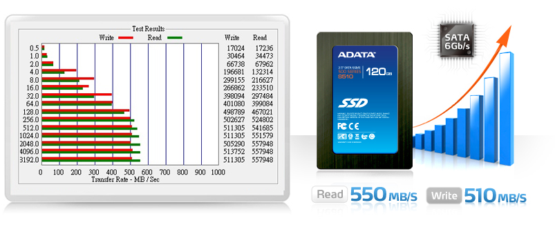 Le prestazioni dichiarate da ADATA sono eccellenti. Con connessione SATA 3 (6 Gb/s), l'SSD raggiunge una velocità in lettura di 550 MB/s ed in scrittura di 510 MB/s. Le IOPS massime 4k in scrittura casuale sono di 85.000. A conferma delle ottime prestazioni, la stessa ADATA pubblica il risultato del benchmark ATTO.