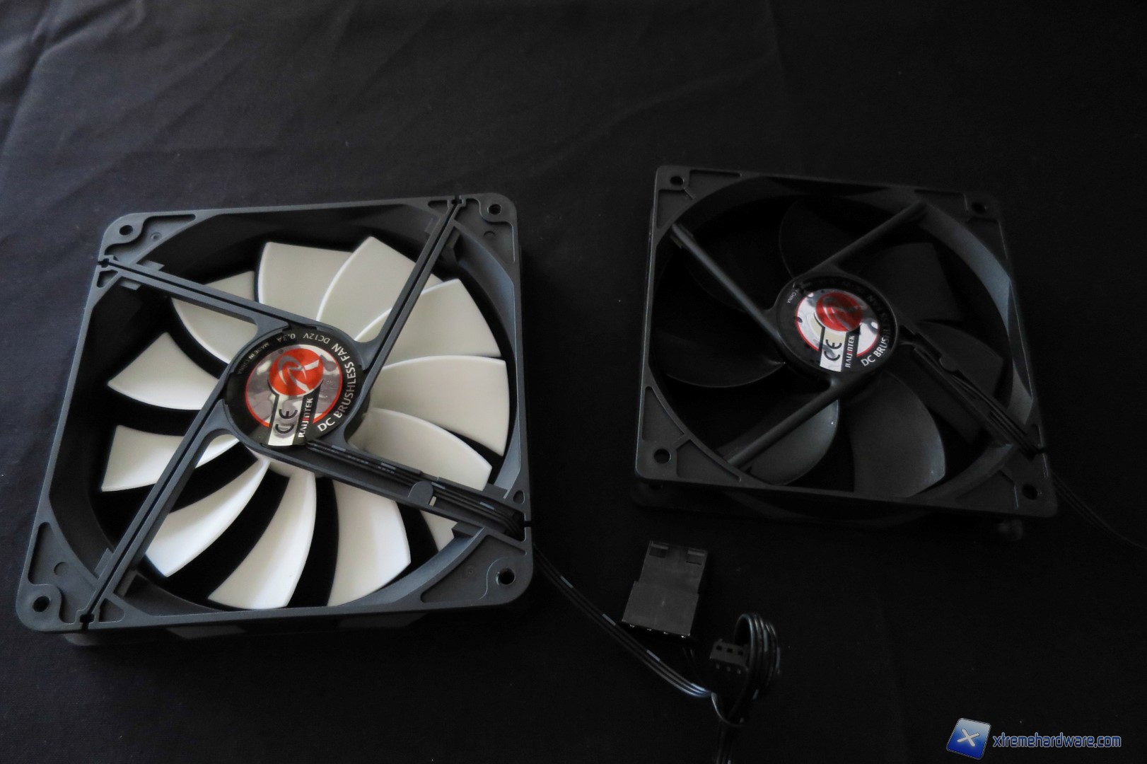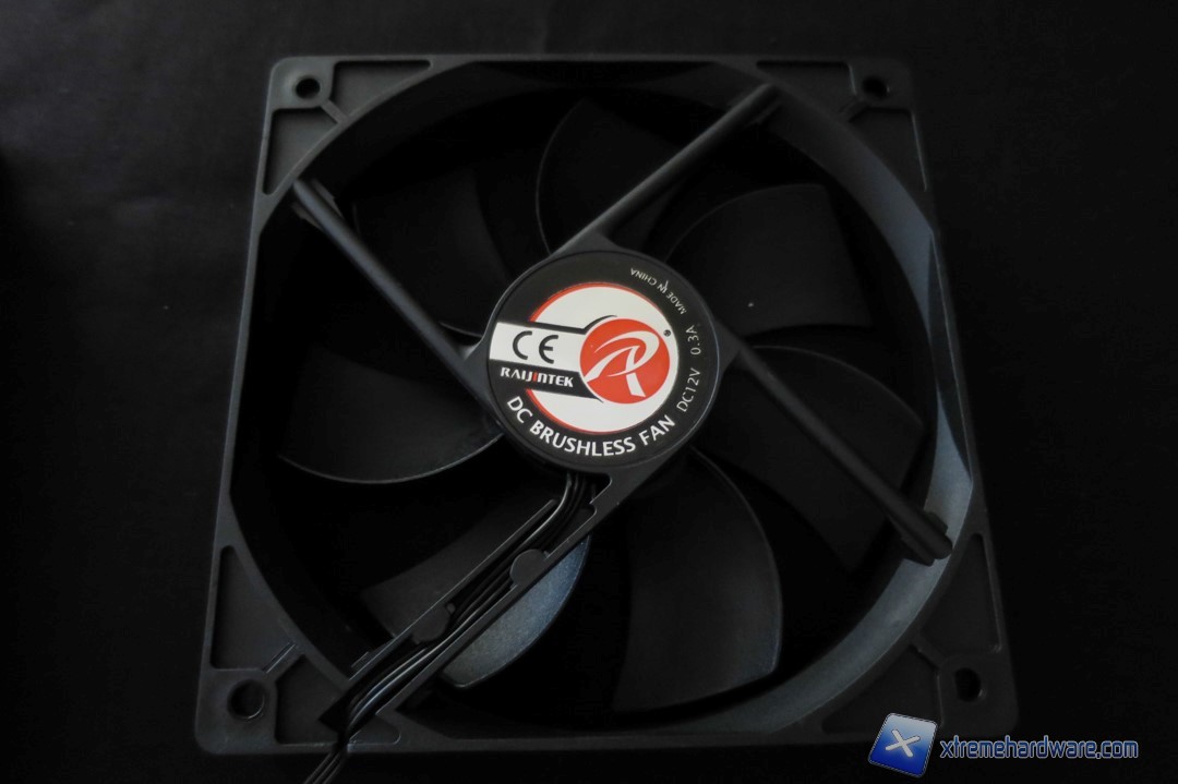 Nel Raijintek Aeneas sono incluse quattro ventole complessivamente di cui due da 140mm e due  da 120mm. Il design delle ventole è classico abbiamo un frame nero con pale bianche per i modelli da 140mm ed un design full black per quelle da 120mm. Le 120mm sono dotate di sette pale mentre i modelli da 140mm ne hanno undici. Non abbiamo o comunque non vengono riportati i modelli per le ventole dunque non possiamo fornirvi le specifiche tecnice. Unica certezza sono i connettori a 3pin più uno aggiuntivo MOLEX.