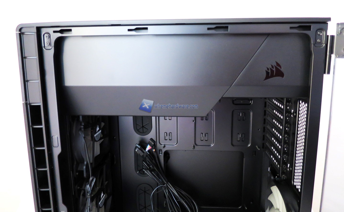 Ora completiamo la vista interna frontale portando lo sguardo alla notevole cover in plastica con l’immancabile nuovo logo di Corsair. Cover in plastica che separerà le due zone come poc’anzi detto.