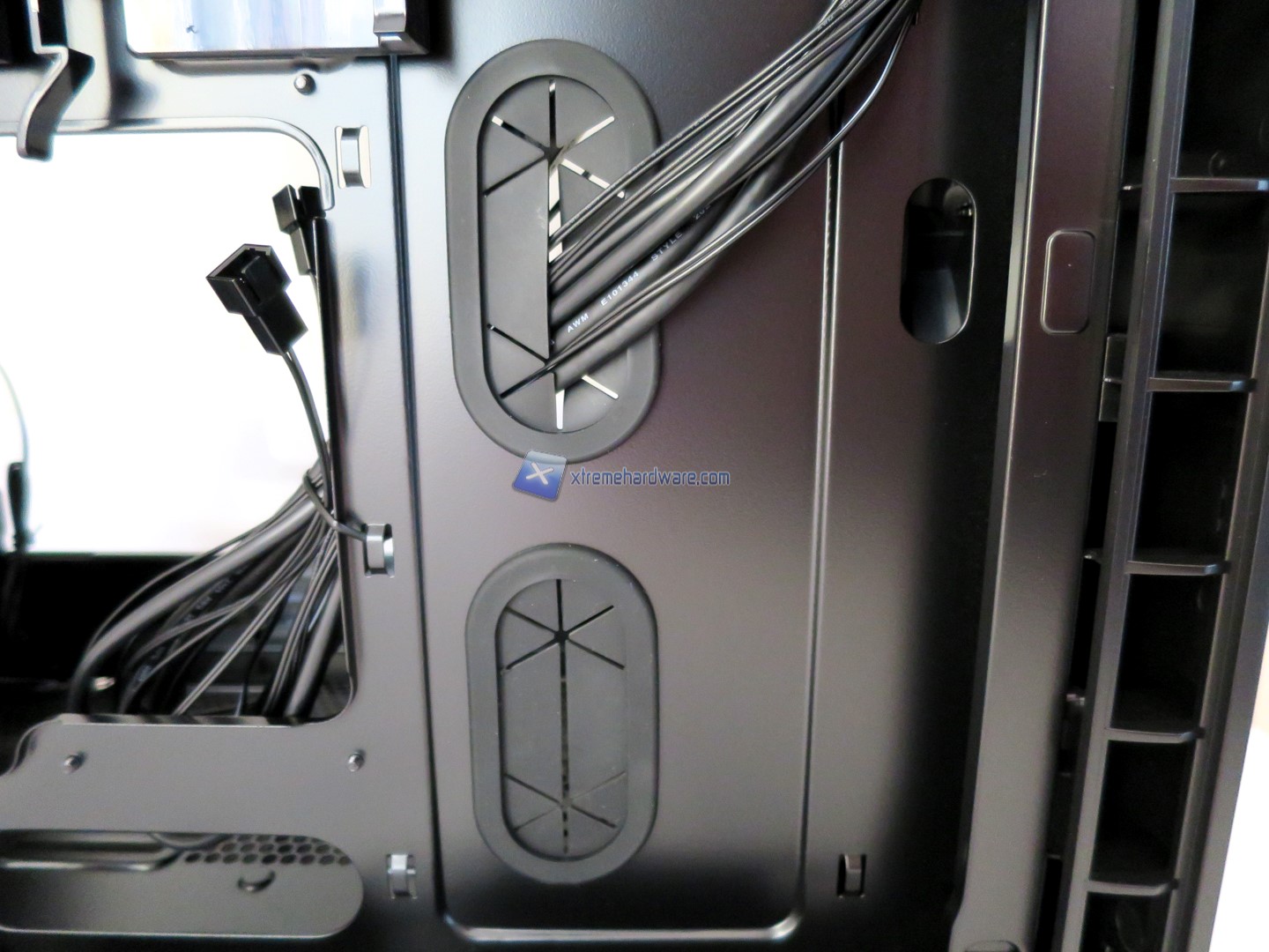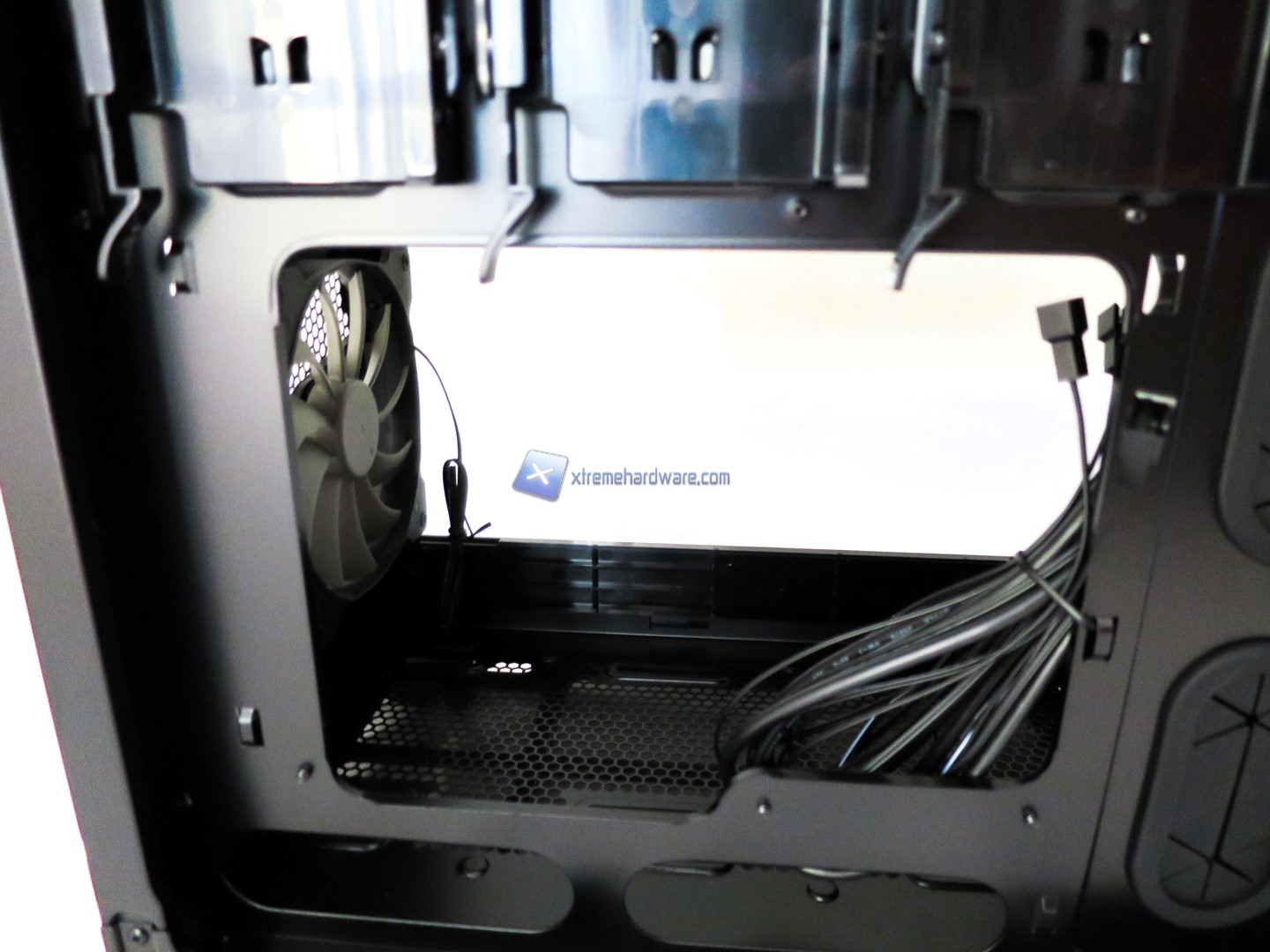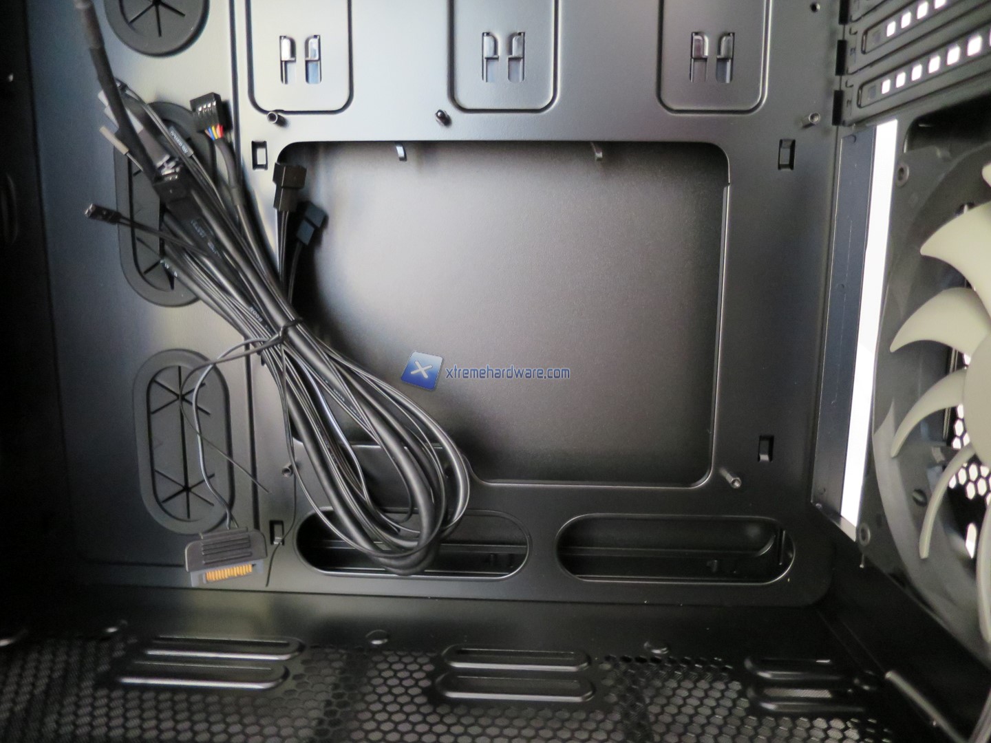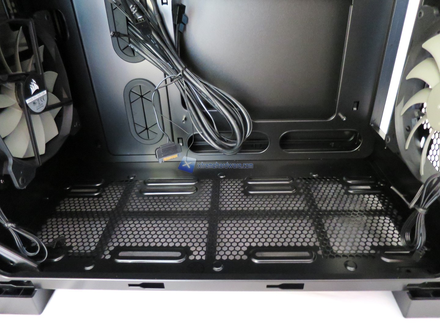 Portandoci nella parte inferiore interna osserviamo meglio anche la griglia che permetterà di installare ulteriori ventole nonché i fori per il passaggio dei cavi tra cui quello 8Pin EPS.