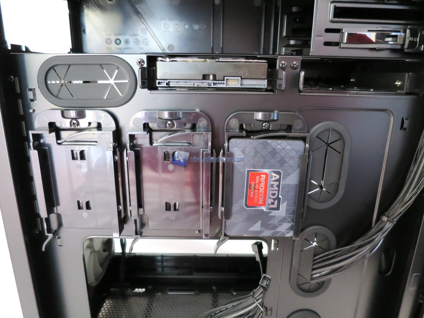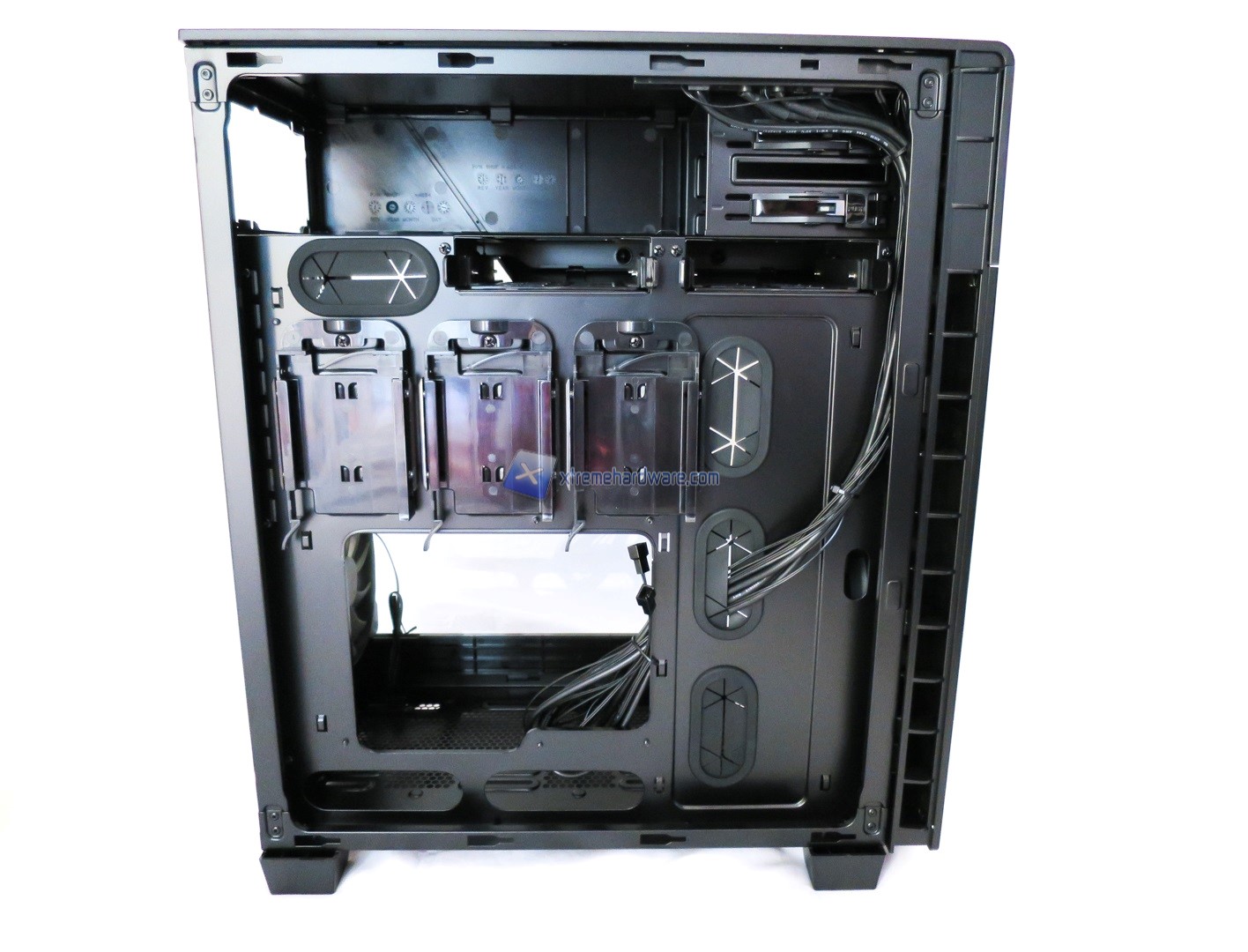 Avvicinandoci ulteriormente alla zona interna del case possiamo notare il tray della scheda madre caratterizzato da un ampio foro per l’installazione a seguire di un dissipatore ad aria o AIO. Questo è inoltre contornato da fori sia nella parte inferiore che quella laterale. Notiamo però come solo i fori laterali siano stati dotati di inserti in gomma mentre quelli inferiori lasciati privi. Soluzione che per alcuni potrebbe risultare un minimo antiestetica. Detto ciò notiamo anche come il Tray visto dalla parte frontale restituisca le zone e inserti utilizzati posteriormente per installare in modo del tutto Tool-Less gli SSD o unità da 2,5’’.