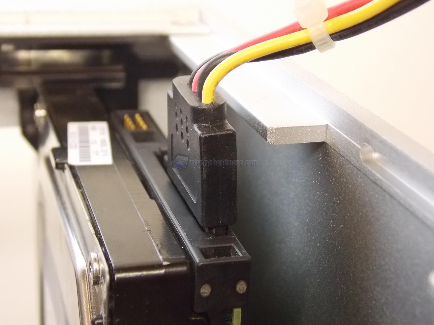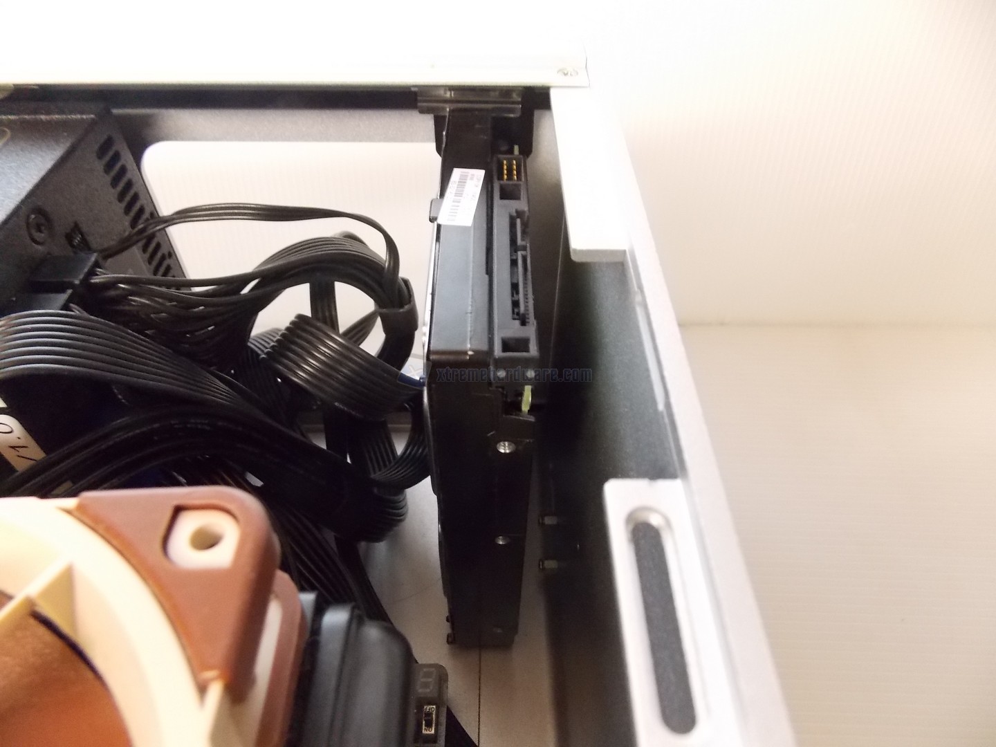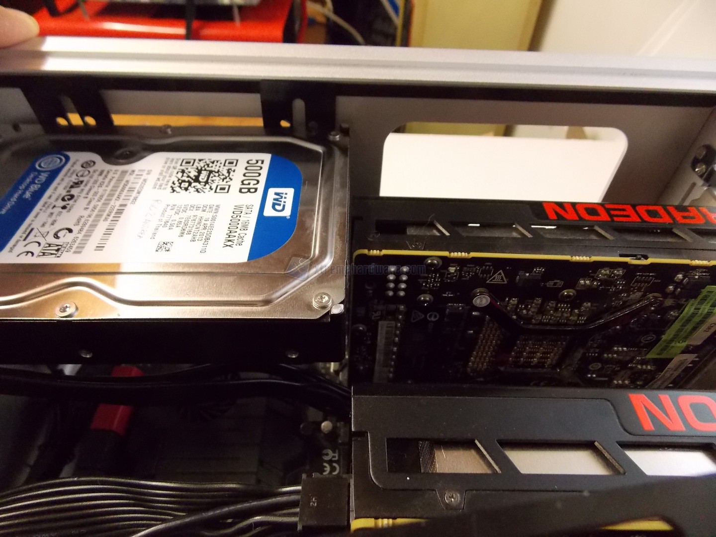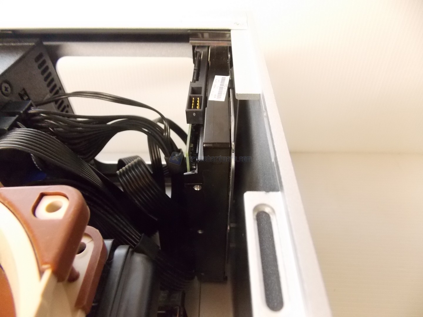 Ponendo l'hard disk da 3.5" verticalmente non è altrettanto possibile alimentarlo per via dell'altezza dello stesso, data la presenza della scheda madre nella porzione inferiore. Sarebbe stato possibile invece, con una scheda madre mini-ITX, installare i dischi lateralmente in posizione verticale, similmente a quanto fatto nella porzione sinistra del case, lato PSU.
