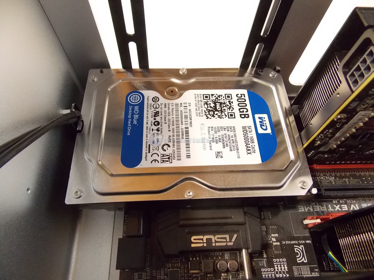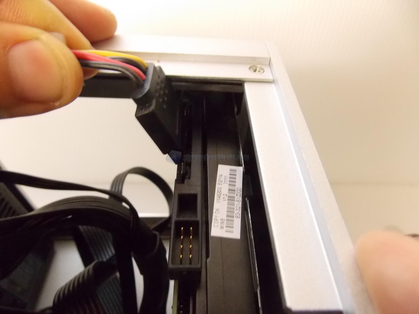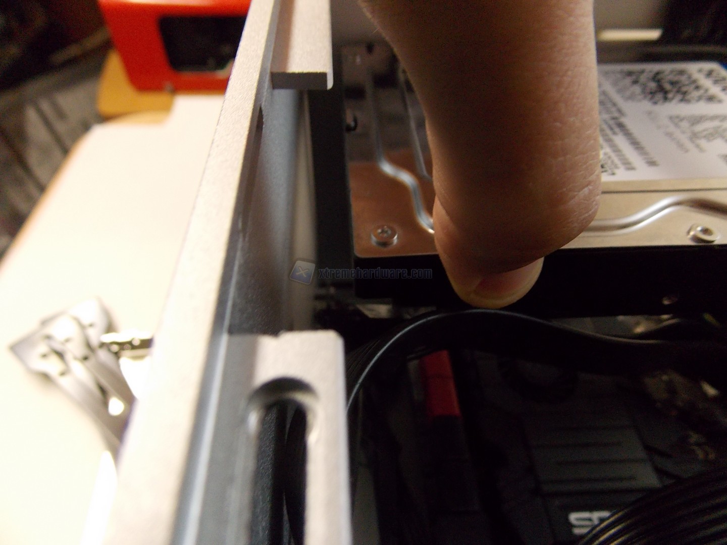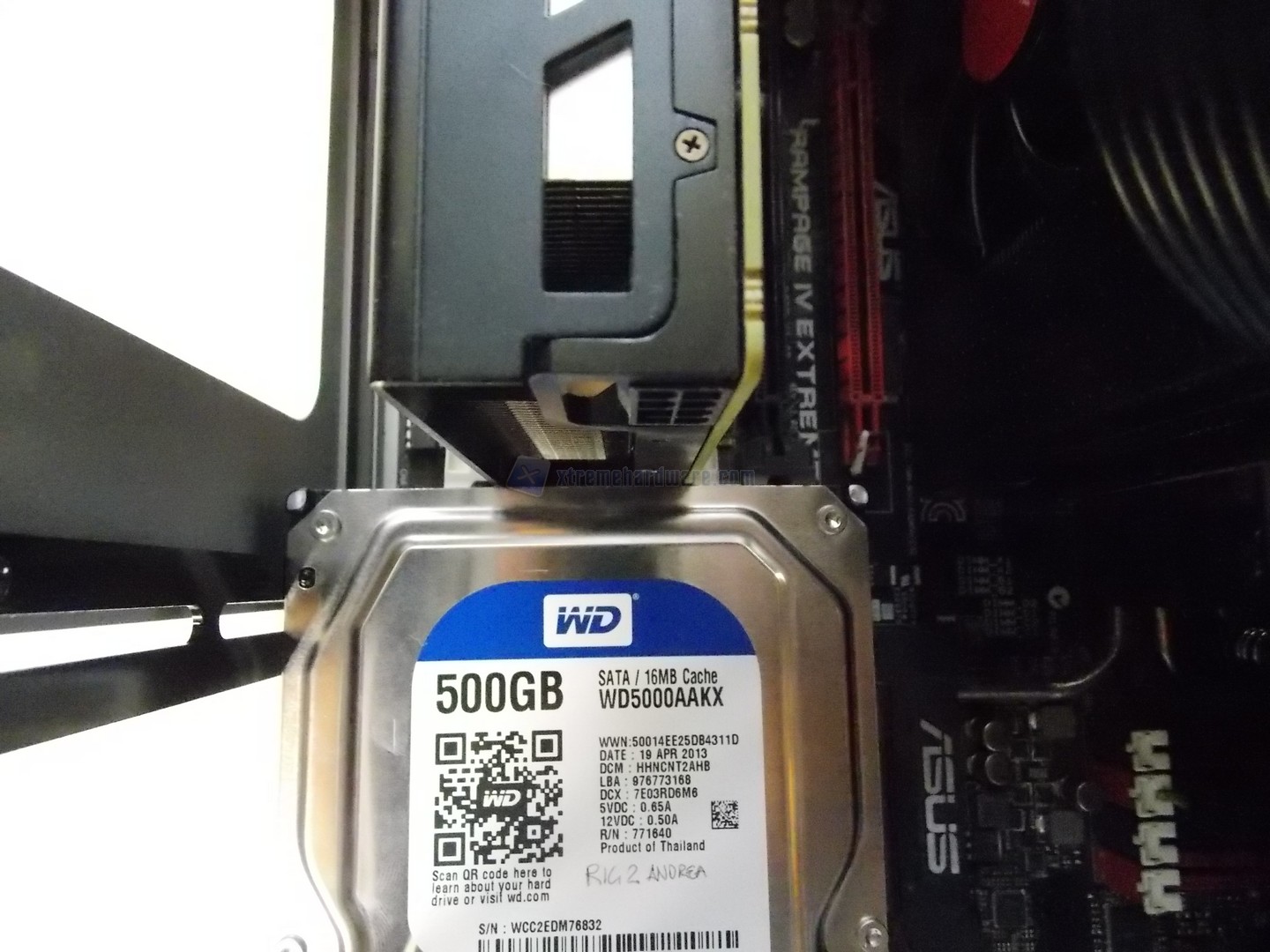 Ponendo l'hard disk da 3.5" verticalmente non è altrettanto possibile alimentarlo per via dell'altezza dello stesso, data la presenza della scheda madre nella porzione inferiore. Sarebbe stato possibile invece, con una scheda madre mini-ITX, installare i dischi lateralmente in posizione verticale, similmente a quanto fatto nella porzione sinistra del case, lato PSU.