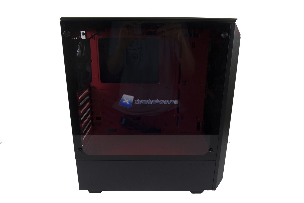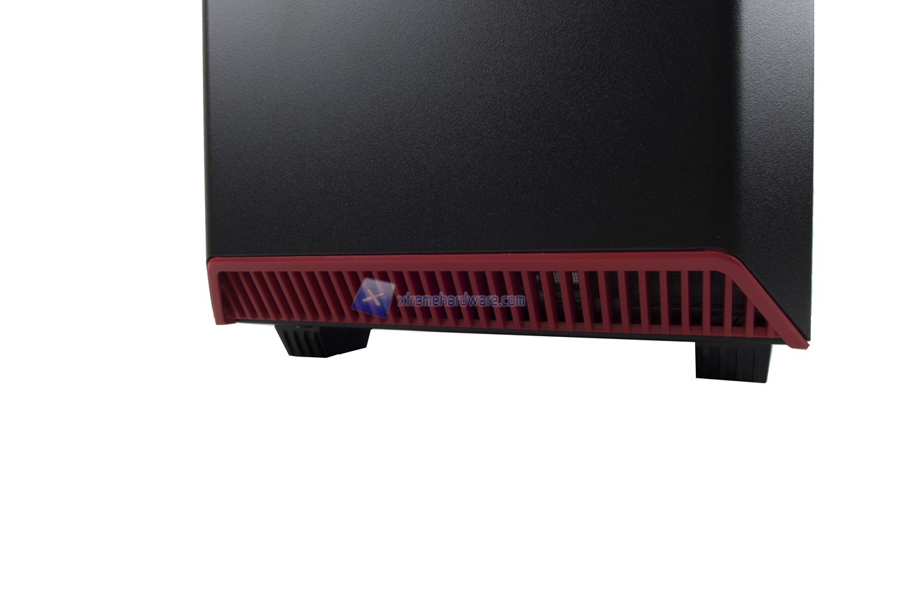 Il pannello frontale ormai privo di alcun slot per unità ottiche o griglie per ventole dirette offre prese d’aria superiori ed inferiori andando a convogliare in maniera diversa l’aria per la dissipazione interna in presenza anche di ventole poste subito dopo insieme ad un eventuale AIO da 240 mm o 280 mm.