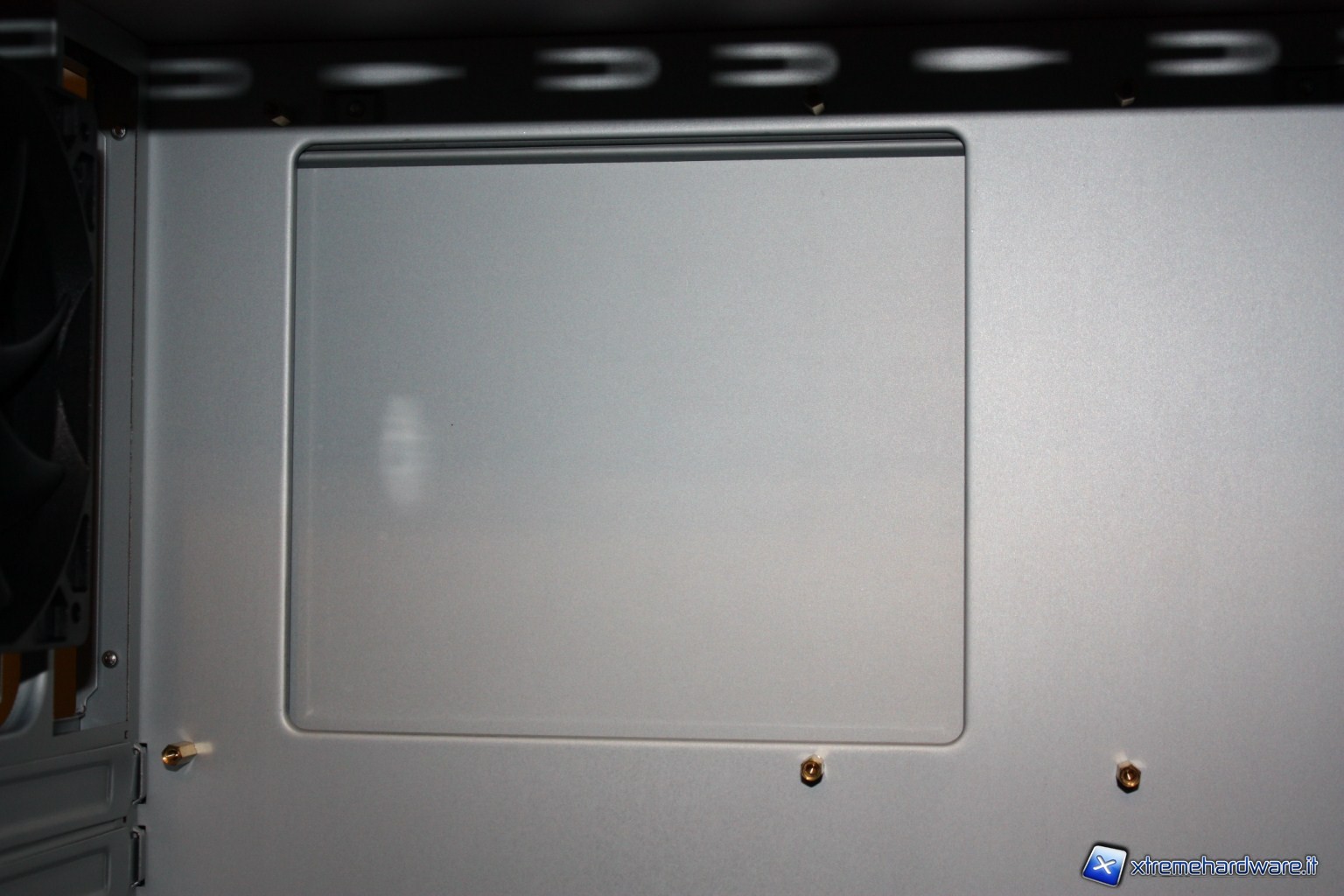 La parte interna del Gekkou è di colore grigio, tipica dell’acciaio SECC non verniciato. Si nota subito la finestra in corrispondenza della cpu che ci permetterà di cambiare il dissipatore senza smontare l'intera scheda madre.