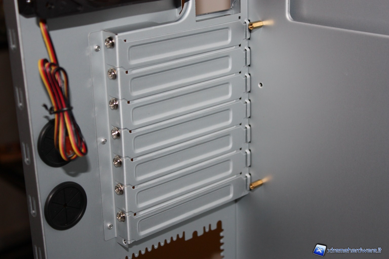 Le periferiche pci che potranno essere istallate sono 7, come nella quasi totalità dei case. I copri slot PCI sono in materiale economico e non è purtroppo presente alcun sistema di montaggio tool-free. Troviamo infatti le classiche viti.