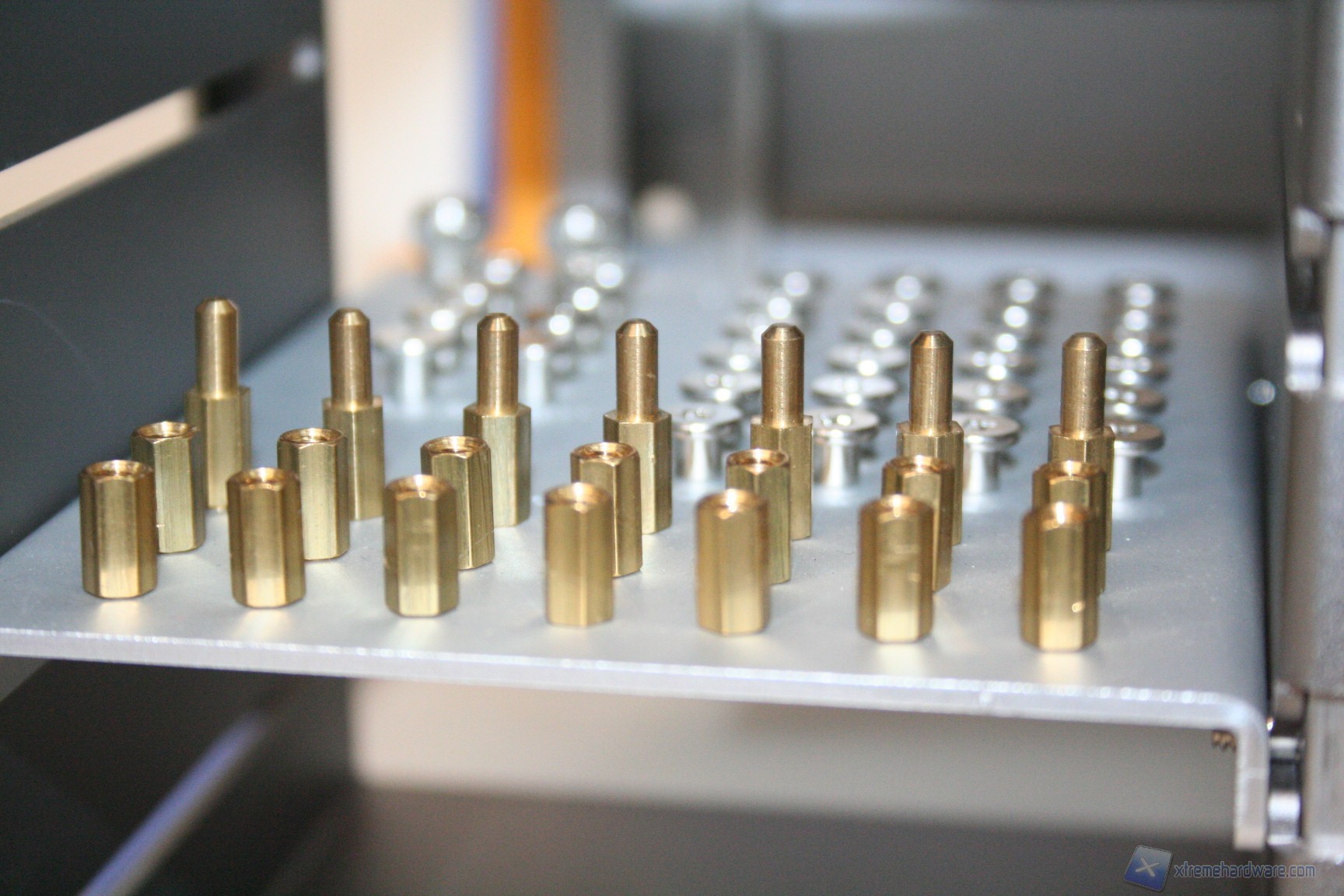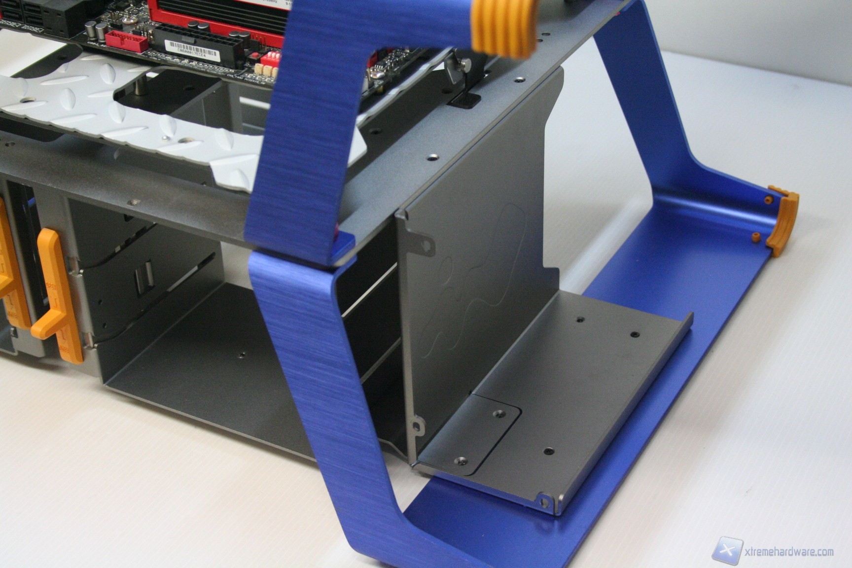STRUTTURA APERTA: teoricamente una configurazione del genere permette una grande dissipazione termica. L’assenza di ventole dedicate però permette l’aumento di temperature per le singole componenti non raffreddate in modo attivo, quali MOSFET’s di alimentazione, hard disk e porzioni secondarie tra cui le RAM. Data la dissipazione passiva di questi elementi però non c’è nessun problema funzionale. Grazie all’orientabilità dell’X-frame sarà possibile simulare le più disparate configurazioni nei cabinet, valutando come l’effetto della gravità possa incidere sia sul funzionamento dei componenti, sia sui flussi d’aria tra di essi. Ai fini della simulazione dei cabinet si poteva chiedere la possibilità di montare delle paratie laterali configurabili, ma evidentemente l’X-frame non è stato di certo progettato per questo scopo. La sua versatile struttura oltrepassa già i limiti convenzionali della totalità degli altri banchetti.