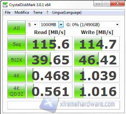 Anche in questo Bench l’HD si rileva molto performante e mantiene la velocità di lettura e scrittura sempre tra i 100 e 120MB/s